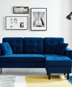 Baita Canapés D’angle Canapé D’angle En Velours Bleu Et Pieds Bois 4 Places Et 2 Coussins