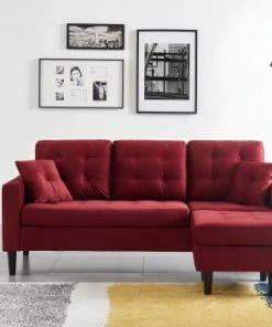 Baita Canapés D’angle Canapé D’angle En Velours Grenat Pieds Bois 4 Places Et 2 Coussins