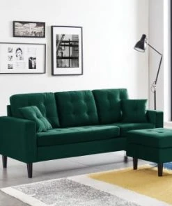 Baita Canapés D’angle Canapé D’angle En Velours Vert Et Pieds Bois 4 Places Et 2 Coussins