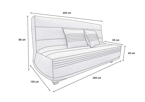 Dimensions canapé 140cm (3-4 places) : L205xl100xH98cm – Dimensions assise : L205xP55xH48cm – Dimensions couchage : 140x200cm