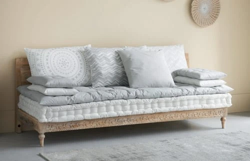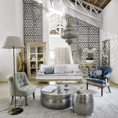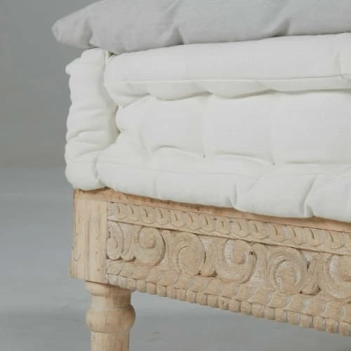 Plus qu’une invitation à la détente, la banquette 2/3 places en coton gris et blanc MATALA vous propose un voyage à l’autre bout du monde. Pensée dans les moindres détails, cette banquette exotique vous étonnera par sa structure en manguier massif à l’aspect sculpté et patiné. Cette banquette mise sur la superposition des coussins et des couleurs pour créer une atmosphère douce et cosy. Ajoutez une table basse en manguier blanchi pour un résultat harmonieux.