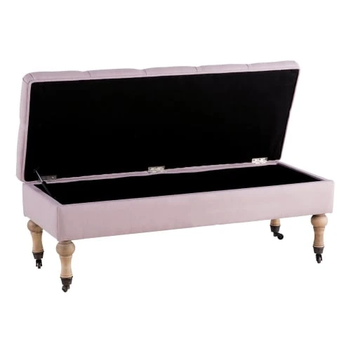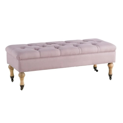 L’esprit boudoir s’invite chez vous avec la banquette coffre rose COLETTE. Découvrez ses courbes élégantes et raffinées, qui ajouteront une touche classique à votre intérieur. Ses pieds en bois naturel et son assise en lin capitonné s’harmoniseront avec délicatesse et originalité dans votre chambre. Son coffre de rangement très discret sera pratique pour y ranger tous vos objets du quotidien. Voyez la vie en rose !