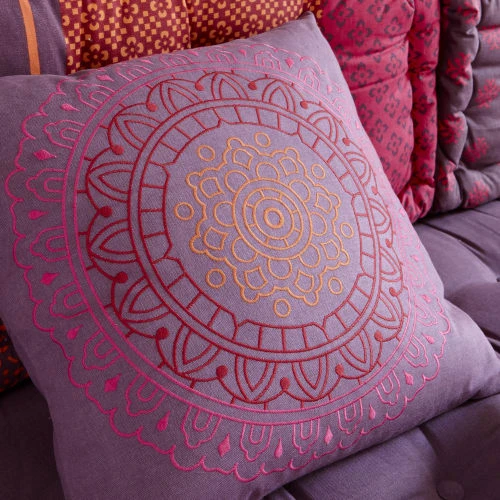 1 coussin brodé 50×50 cm : Revêtement coton et garnissage 100% polyester (déhoussable)
