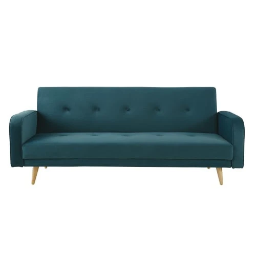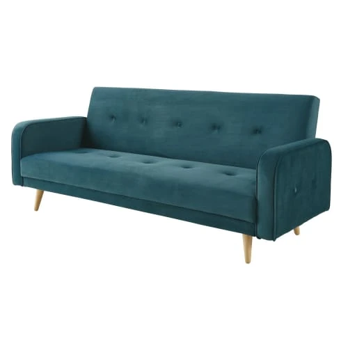 La douceur du canapé-lit 3 places en velours bleu pétrole BROADWAY va forcément vous séduire ! Vous allez adorer son toucher velours, combiné à un coloris tendance qui amènera du caractère dans votre pièce de vie. Son piétement en hévéa s’offre une forme oblique pour un clin d’oeil au mobilier de style scandinave. On adore le petit détail subtile qui apporte un brin d’originalité : les capitons positionnés sur l’assise, le dossier et les accoudoirs. Besoin d’un couchage supplémentaire ? Ce canapé convertible se transformera en lit d’appoint. Pour le compléter, il ne vous restera qu’à choisir les coussins qui correspondront au ton que vous souhaitez donner à votre pièce de vie. Alors, on craque ?