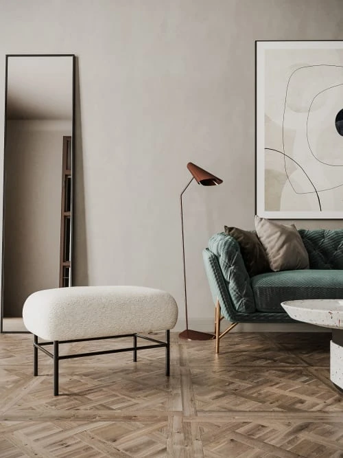 matière : Structure en bois de pin, bois d’ingénierie et métal – Rembourrage en mousse – Laine bouclée synthétique 100% polyester